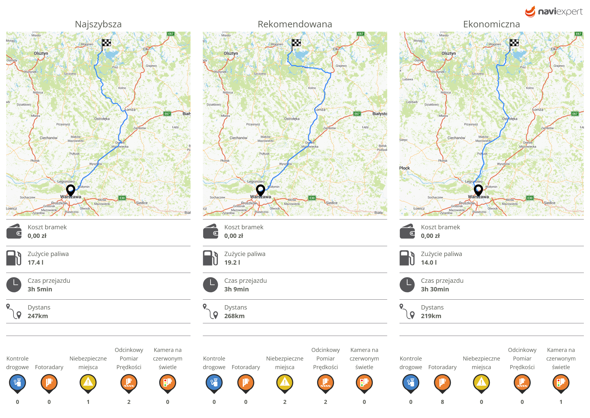 Trasa ekonomiczna to strzał w dziesiątkę dla lubiących oszczędzać. Prawie 50 kilometrów i 5 litrów benzyny zaoszczędzimy w zależności od tego, którą trasę ze stolicy na Mazury wybierzemy. Jeśli zdecydujemy się na wersję oszczędnościową, trzeba liczyć się z dłuższym czasem podróży. W ramach trasy spalimy mniej paliwa (o 30 zł), ale pojedziemy dłużej (o 25 min. względem trasy najszybszej i 20 minut względem rekomendowanej). Na trasie miniemy aż 8 fotoradarów (Warszawa, ul. Modlińska, Dzierżenin, Kacice, Dobrołęka, Antonie, Kadzidło, Myszyniec, Zgon),1 kamerę na światłach - Jabłonna, rondo Biskupów Płockich i musimy się liczyć z utrudnieniami w postaci rozbudowy drogi krajowej nr 61 pomiędzy Legionowem a Zegrzem - 4,5 kilometrowy odcinek zyska klasę GP - droga główna ruchu przyspieszonego, a w miejscu obecnego ronda (skrzyżowanie DK61 z DW631) powstanie węzeł Zegrze. Jeżeli więc zależy nam na czasie, to do celu najszybciej dotrzemy trasą rekomendowaną lub najszybszą. Podróż będzie wtedy trwać odpowiednio 3 h 9 min. lub 3 h 5 min. W obu przypadkach miniemy 2 odcinkowe pomiary prędkości na S8 - jeszcze w Warszawie Łabiszyńska - Piłsudskiego oraz na wysokości Wyszkowa. Trasa rekomendowana to o 1 fotoradar – w miejscowości Budy Czarnockie za Łomżą – i niebezpieczne miejsce więcej. Dodatkowo warto pamiętać o zwężeniu do jednego pasa na obwodnicy Ostrowi Mazowieckiej w ciągu S8 (rekomendowana i najszybsza). Przy wyborze trasy miejmy na uwadze, że opcja najszybsza jest polecana doświadczonym kierowcom - może prowadzić lokalnymi skrótami, które nierzadko oznaczają zjazd z głównej drogi i trudniejsze manewry.