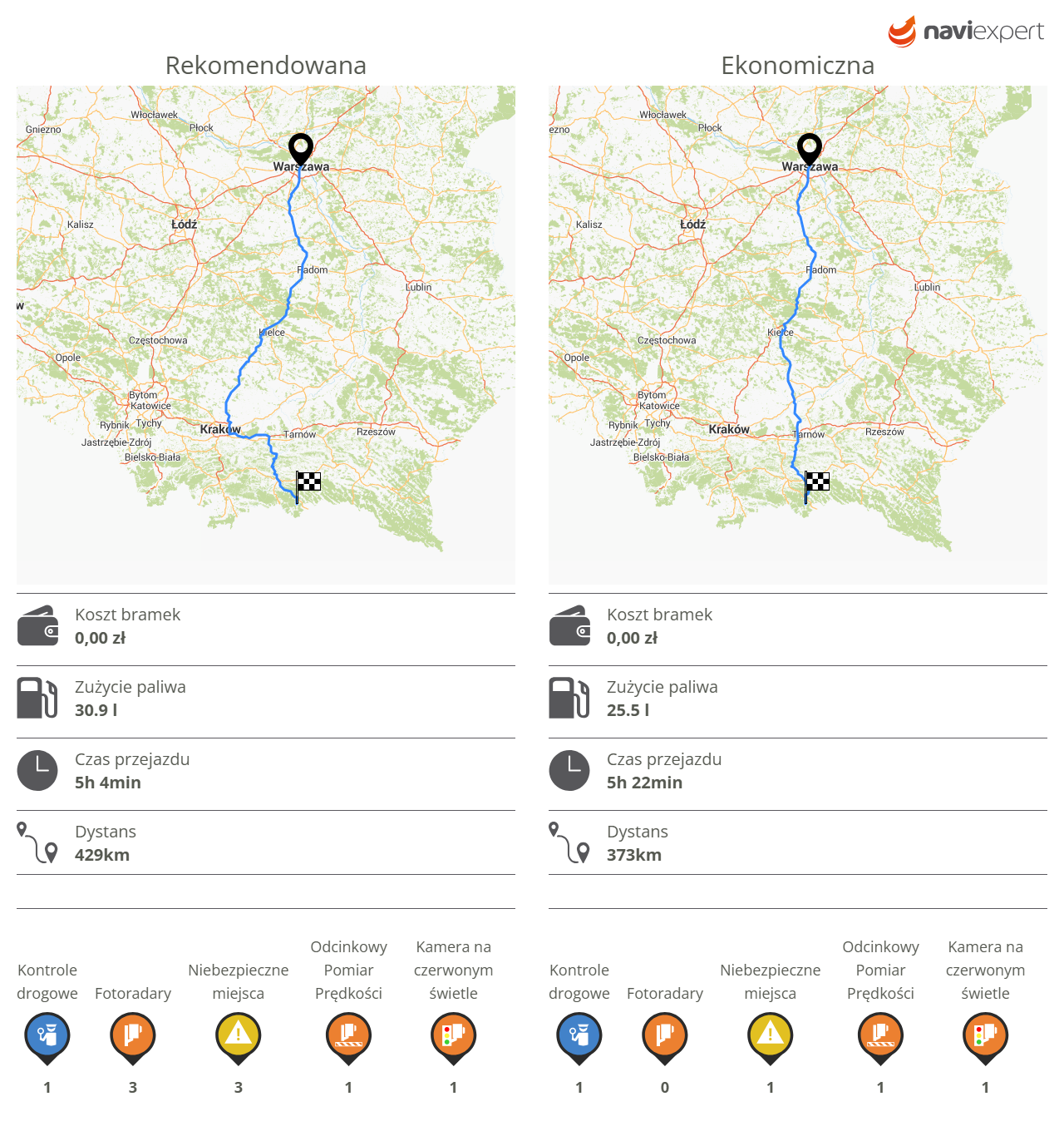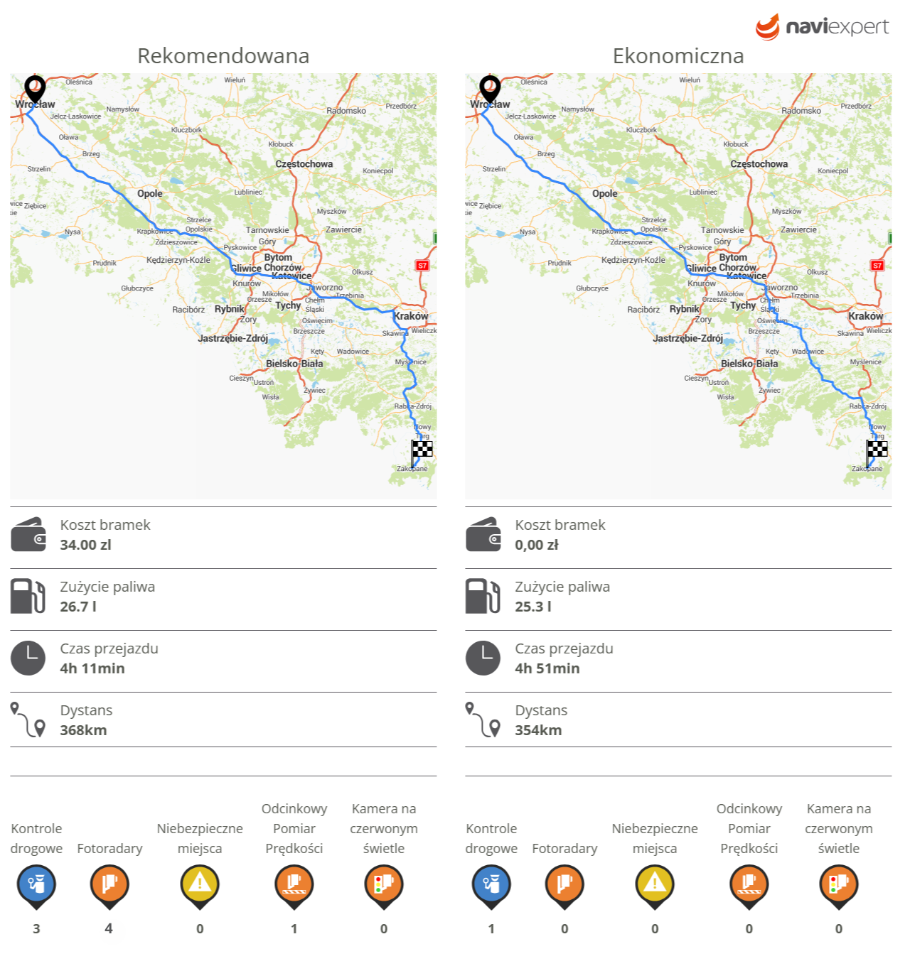 Podobne do siebie trasy, a przynajmniej z pozoru. Mają ten sam przebieg, aż do węzła Brzęczkowice (A4). Decydując się na rekomendowaną pokonamy 368 km, a ekonomiczną - 354 km i spalimy po ok. 26 l (ok.150 zł). Ta pierwsza zagwarantuje nam jednak o 40 min. szybsze dotarcie na miejsce, ale wiąże się z większymi kosztami - za bramki zapłacimy 34 zł (A4 Katowice i Kraków). Jeżeli chodzi o potencjalne drogowe niespodzianki, to możemy spodziewać się 3 kontroli drogowych, 4 fotoradary (DK7- Gaj, Żary, Dół, Jawornik) i 1 OPP (S7 – tunel na Zakopiance). Największe utrudnienia spotkają nas na trasie pomiędzy Katowicami a Krakowem - na A4 prowadzonych jest wiele prac remontowych, m.in. w okolicach węzła Brzęczkowice, Jeleń, Chrzanów czy przed MOP Morawica. Utrudnienia drogowe mogą dać się kierowcom we znaki również na DK7 w Libertowie, Krzyszkowicach i na wjeździe do Myślenic. Wybierając trasę ekonomiczną, zaoszczędzimy na bramkach (0 zł), a na trasie jedyne co nam grozi to kontrola drogowa. Wydłuży jednak czas podróży z ok 4 do 5 godzin. Po zjechaniu z A4 kierujemy się krótkim fragmentem drogą S1, aby dotrzeć do Imielina, a później do Oświęcimia, Wadowic i Makowa Podhalańskiego, by w Skomielnej Białej wrócić na ten sam szlak co trasa rekomendowana. Przejazd trasą ekonomiczną może okazać się spokojniejszy, ponieważ po drodze nie spotkamy fotoradarów, odcinkowych pomiarów oraz ominiemy większość trwających remontów.