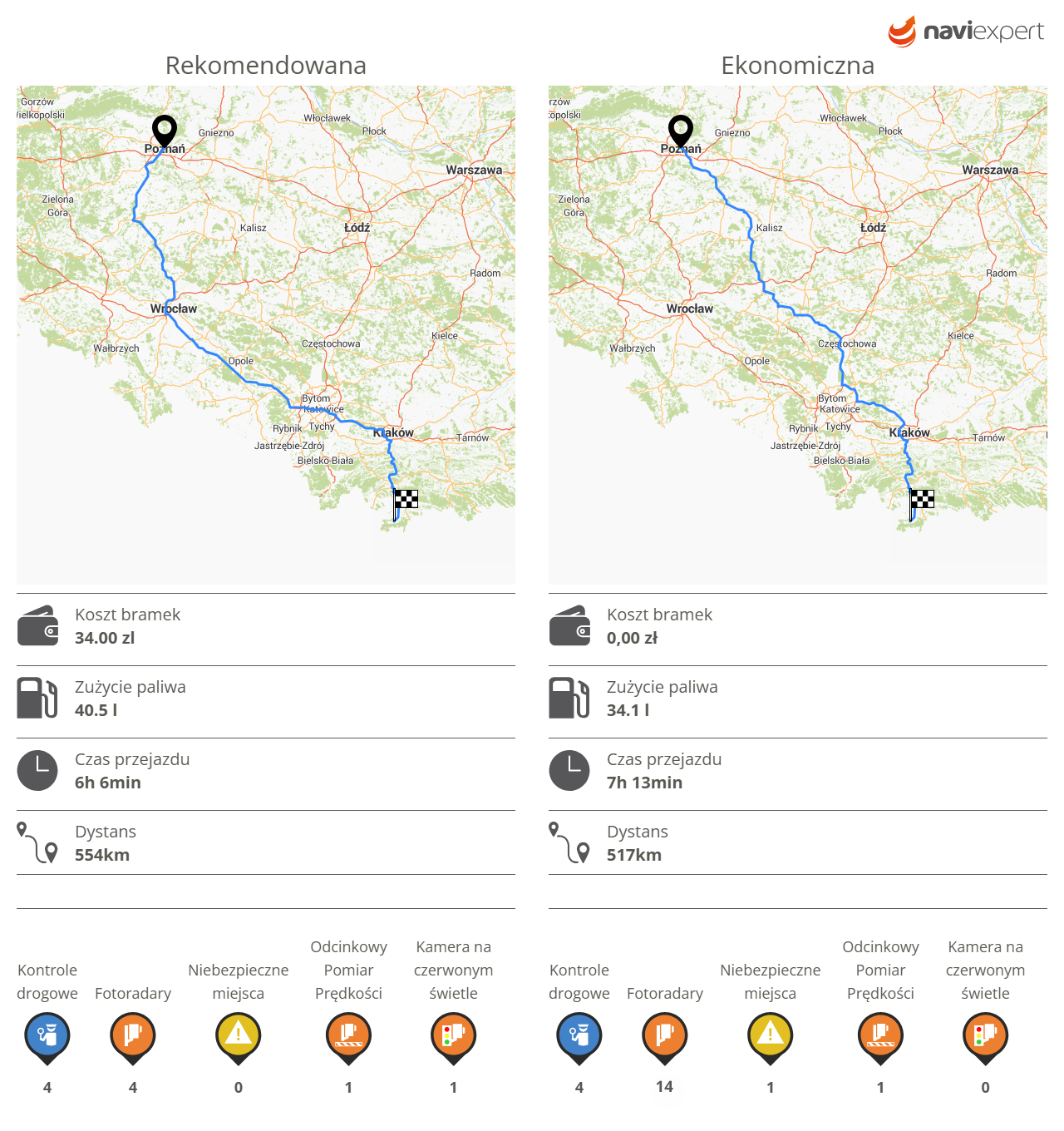 Różnice w czasie i kosztach podróży są odczuwalne. Wybór numer jeden to droższa trasa rekomendowana, którą przejedziemy w 6 godzin, zużyjemy 40.5 l paliwa i zapłacimy 34 zł (A4 - Katowice - Kraków, podwyżki) za bramki oraz spotkamy 4 fotoradary (DK7 Gaj, Żary, Dół i Jawornik) i 1 kamerę na światłach już na wylocie z Poznania - Komorniki, skrzyżowanie ulic Poznańskiej z Gottlieba, a przed samym Zakopanem - 1 OPP (S7 tunel na Zakopiance). A4 przed węzłem Chrzanów przełożenie ruchu. Ponad godzinę dłużej zajmie postawienie na trasę ekonomiczną. Spalimy wtedy znacznie mniej paliwa (34 l - to 37 zł mniej wydane na stacji) i ominą nas opłaty na bramkach (-34 zł), jednak po drodze miniemy aż 14(!) fotoradarów (Żabikowo, Brodowo, Nowe Miasto nad Wartą, Witaszyce, Szczury, Niedźwiedź, Piaski, Libidza, Bolesław, Przeginia, Gaj, Żary, Dół i Jawornik) i wspomniany już OPP na Zakopiance. W obu przypadkach możliwe kontrole drogowe. Utrudnienia na przebudowywanej DK7 w Libertowie. Koniec prac zaplanowano w połowie 2027 roku.