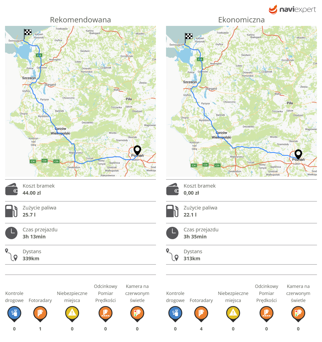 Ceniących czas może zainteresować trasa rekomendowana, przez A2/E30, Święty Wojciech, S3/E65, Szczecin. Choć podróż zajmie niecałe 3,5 godziny, to trzeba liczyć się płatnościami na bramkach - 44 zł (A2 Jordanowo, podwyżki od 11 marca). Na trasie miniemy raptem 1 fotoradar (Poznań, ul. Głogowska). Z mniejszym zużyciem paliwa (22.1 l) i bez dodatkowych opłat - dzięki czemu zaoszczędzimy blisko 70 zł, ale o ponad 20 minut dłużej pojedziemy trasą ekonomiczną przez: Pniewy i Gorzów Wielkopolski. Po drodze natkniemy się na 4 fotoradary: Poznań ul. Dąbrowskiego, Bytyń, Podrzewie, Przytoczna. Wszystkie na odcinku między Poznaniem a Skwierzyną (DK92 i DK24). Utrudnienia na rozbudowanym odcinku S3 Troszyn - Wolin, (na części trasy trwają prace wykończeniowe, a na części duże utrudniania i przełożenia ruchu).