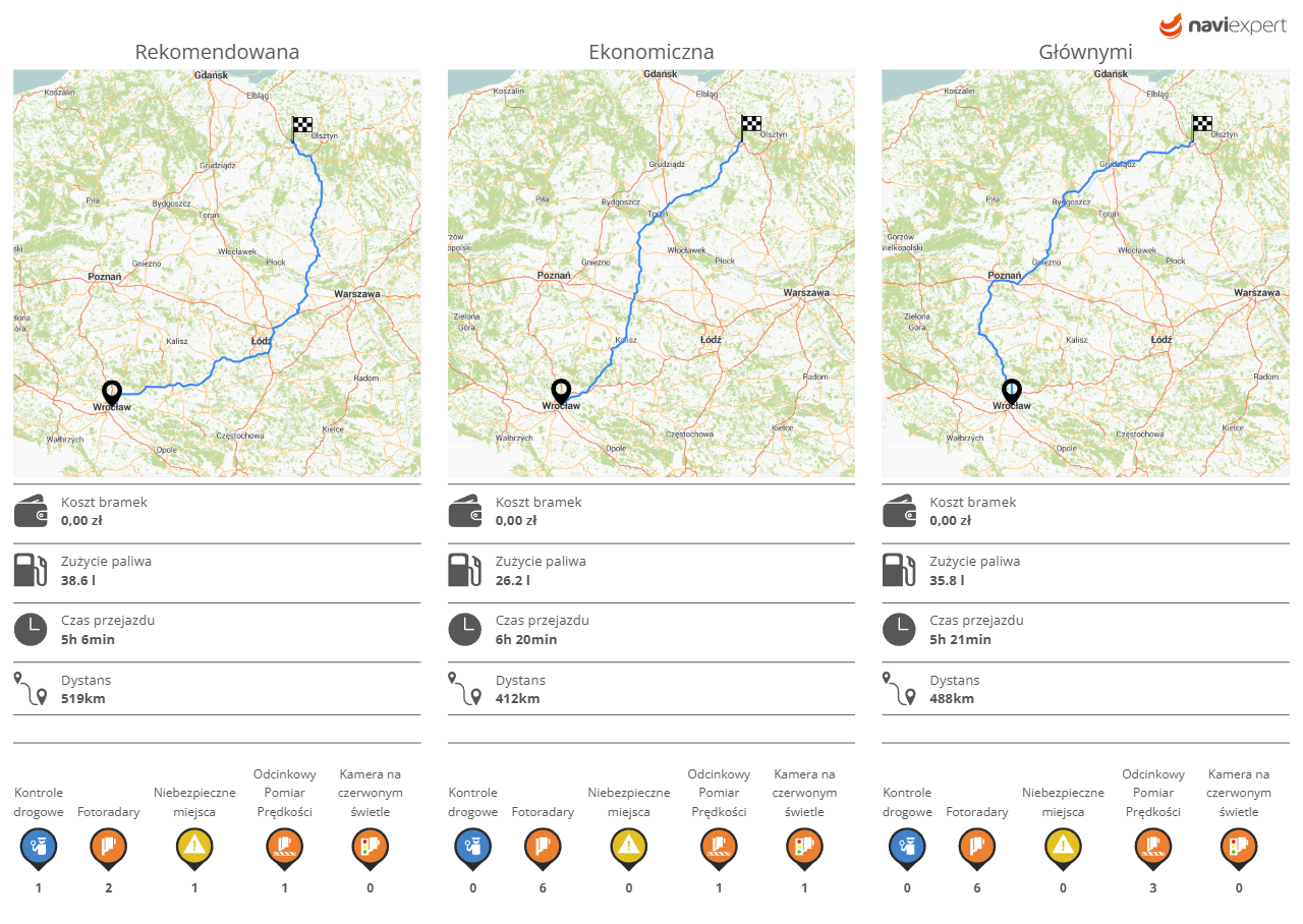 Prezentowane trasy (ich przebieg, czas podróży, liczba kontroli) są trasami proponowanymi przez nawigację NaviExpert i uwzględniają odcinki płatne. Analizując je należy pamiętać, że system wyznaczając tę samą trasę innego dnia, o innej porze, w innych warunkach drogowych, może zaproponować inny jej przebieg. Trasy zostały wytyczone w poniedziałek, 11 sierpnia i bazują na danych historycznych z 15 sierpnia ubiegłego roku, w południe, a więc wtedy, kiedy w systemie NaviExpert odnotowano największy ruch związany z wyjazdami na długi weekend sierpniowy.