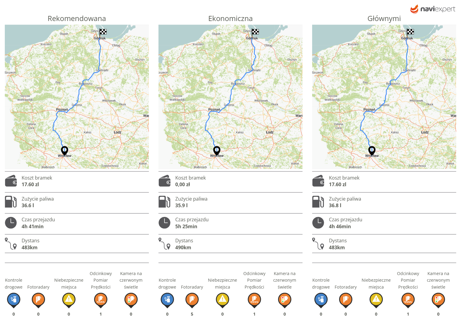 Bez względu na wybór trasy miniemy tylko 1 OPP (A2 między węzłami Poznań Krzesiny i Poznań Komorniki). Najkorzystniej czasowo wypada trasa rekomendowana (4 h 41 min.), przez: S5/E261, Poznań, S5/E261, Świecie, Skórcz. Nie obejdzie się jednak bez opłat na bramce (A1 - od węzła Nowe Marzy do Gdańska) — 17,60 zł. Wybierając trasę ekonomiczną w aucie spędzimy 3 kwadranse więcej, a po drodze miniemy 5 fotoradarów: Górna Grupa, Bzowo, Mała Karczma, Rudno, Subkowy. A ponieważ wiedzie ona przez Pruszcz Gdański (DK91), to będziemy mieć tu do czynienia z dużymi zmianami w organizacji ruchu - ruch jednokierunkowy (w kierunku północnym poruszamy się nitką drogi krajowej, natomiast w kierunku południowym objazd ul. Strzeleckiego oraz ul. Raciborskiego). Dodatkowo, na trasie rekomendowanej i głównymi występują utrudnienie na A1 pomiędzy węzłami Pelplin i Kopytkowo (ruch jedną nitką, ograniczenie prędkości 80 km/h). Te prace zakończą się w drugiej połowie sierpnia. Podobna sytuacja występuje między węzłami Pelplin i Swarożyn, z tą różnicą, że prace mają potrwać od 11 sierpnia przez ok 5 tygodni. Na obu trasach natkniemy się też na remontowany węzeł Gdańsk Południe - duże zmiany organizacji ruchu, zatory drogowe.